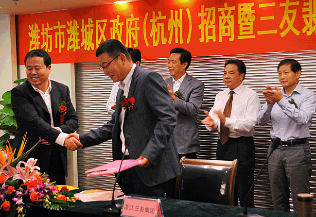 周加洪副主任和杨卫东副主席分别代表浙江省供销社和潍坊市政府对本次潍城区政府在杭州的招商活动暨三友翡翠城二期项目的签约表示了衷心的祝愿,并介绍了浙江省供销社和潍坊市的发展现状,祝愿双方不断加强合作关系、拓宽合作领域,携手共进,为两地的社会经济发展作出新贡献。赵伟宏区长和姜益民董事长分别发表了热情洋溢的致辞,均对双方多年以来的合作予以了高度评价,并期盼和祝愿新大集团、三友集团和潍坊市、潍城区政府之间的良好合作关系能更进一步地深入发展,互利共赢,共创辉煌。