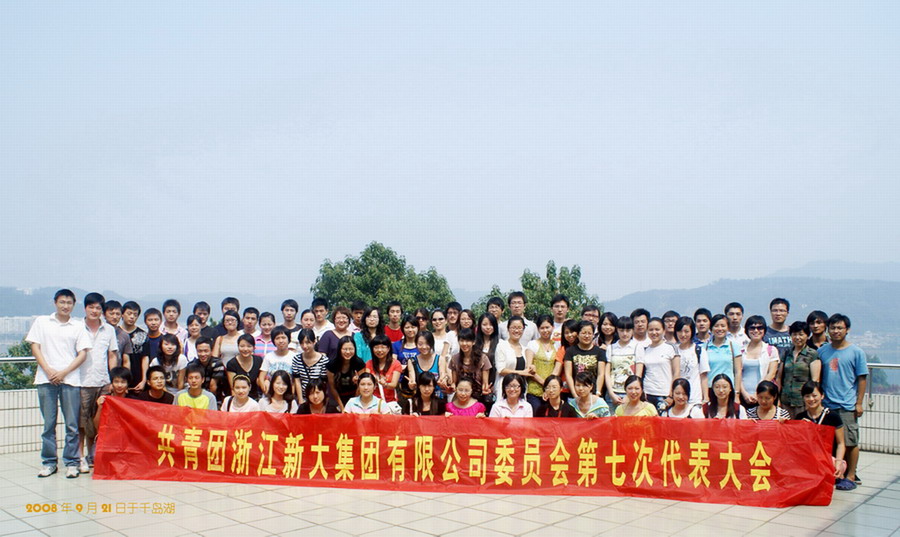 共青团新大集团第七次代表大会于2008年9月21日上午在千岛湖假日酒店召开。大会共有三项议程,开始由六届团委委员毛枕山传达了共青团中央十六大报告精神,传达了胡锦涛总书记对青年的殷切希望“勤于学习,善于创造,甘于奉献,努力成为理想远大、信念坚定的新一代;成为品德高尚、意志顽强的新一代;成为视野开阔、知识丰富的新一代;成为开拓进取、艰苦创业的新一代”。