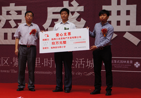 开盘仪式上,姜益民董事长和临朐三友房地产开发有限公司总经理徐超强代表临朐三友房地产开发有限公司向临朐县东郡小学捐款10万元。临朐教育局局长、教工委书记王学鹏发表了热情洋溢的致辞,表示临朐三友房地产开发有限公司在当地有着良好的口碑,在今天“三友·玫瑰园”隆重开盘之际,能无偿的捐赠助学,充分体现了企业的社会责任和爱心,这对于临朐的教育事业是一种促进和鞭策。我们一定把这笔钱用在学校最需要的地方。