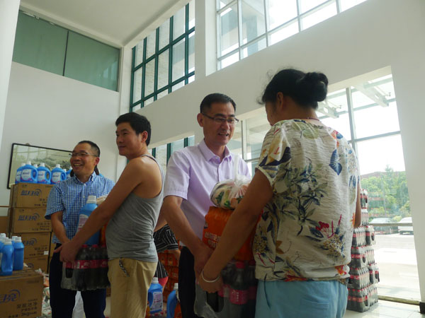 “你们辛苦了,这是我们的一点心意。”许以平主席一行一到厂区,就先同厂领导一起将沉甸甸的高温慰问品发放到工人手中,感谢他们的辛勤付出,向奋战在一线的工人们捎去问候、送上清凉,传递温情。
