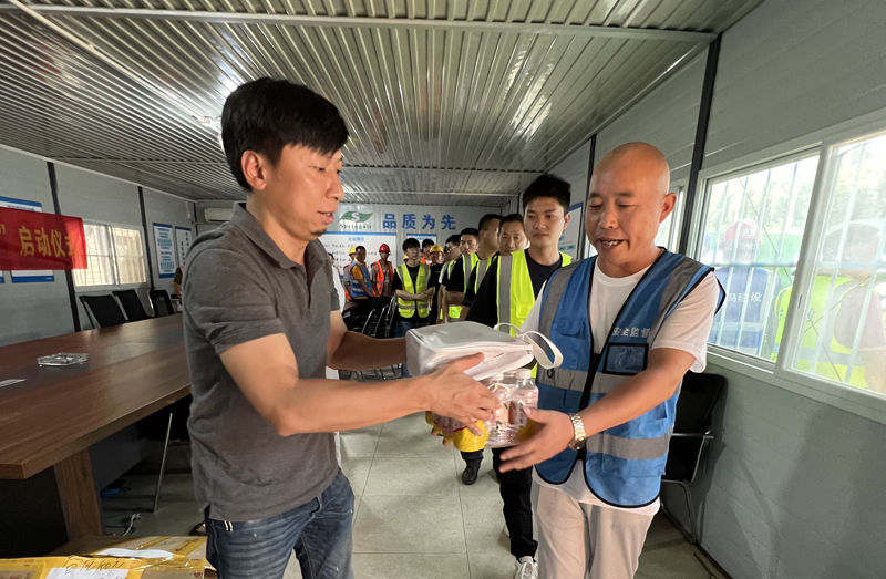 徐超强一行赶赴项目工地,对高温下坚守岗位、抓紧生产工作的一线员工表示诚挚感谢,为他们送上清凉大礼包、饮料等降温防暑用品。并详细了解一线员工的工作、生活状况,嘱咐他们要劳逸结合、保重身体。在项目调研过程中,徐超强指出,项目管理团队要科学安排工期,有效落实各项防暑降温措施,合理分配施工力量错峰施工。同时,要压紧压实安全生产责任,倒排工期、挂图作战、全力攻坚,规范施工管理,杜绝麻痹和侥幸心理,保质保量推进项目建设。